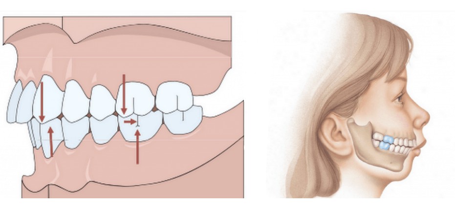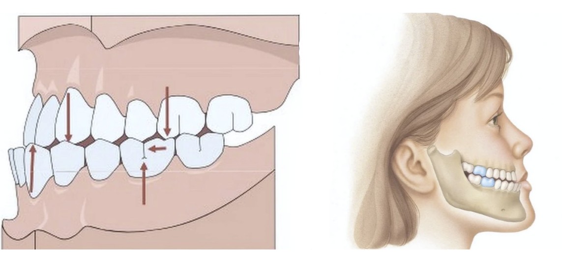 - Underbite The lower teeth sit in front of the upper teeth, often caused by an overdeveloped lower jaw. This can make the chin look too prominent and give the face an asymmetrical appearance.